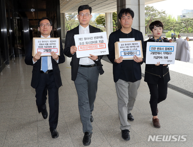 【서울=뉴시스】이윤청 수습기자 = 참여연대가 효성 총수일가의 횡령 혐의 고발 및 탈세 제보를 위해 30일 서울 서초구 서울중앙지방검찰청으로 향하며 발언하고 있다. 2019.04.30.